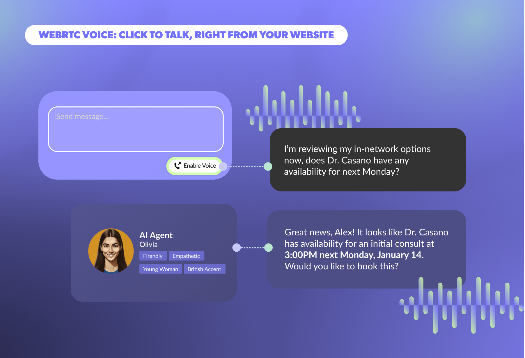 WebRTC Voice enables real-time voice conversations: instead of dialing phone numbers or switching applications, customers can enable voice conversations directly in your website widget.