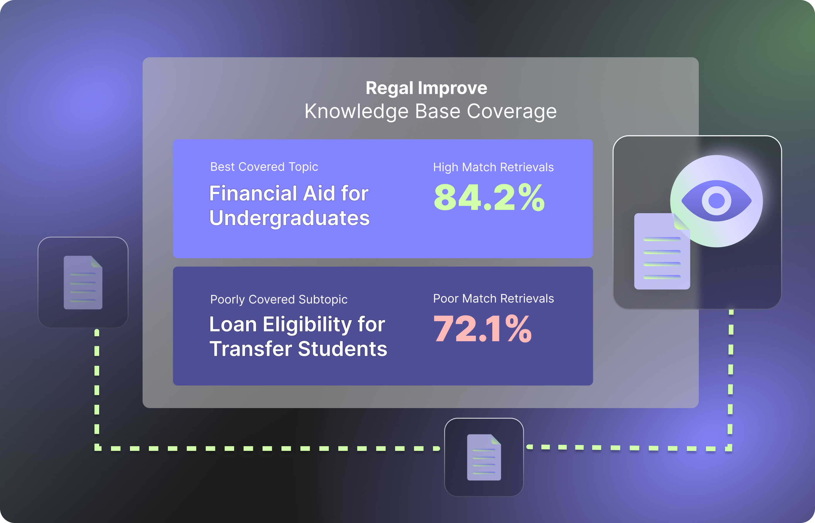 Customer conversations are inherently dynamic, and Regal Improve’s Knowledge Base Coverage tracks changes in retrieval performance over time and at scale. This makes it easy to verify that KB updates increase coverage and if your documentation is keeping up with evolving customer requests.