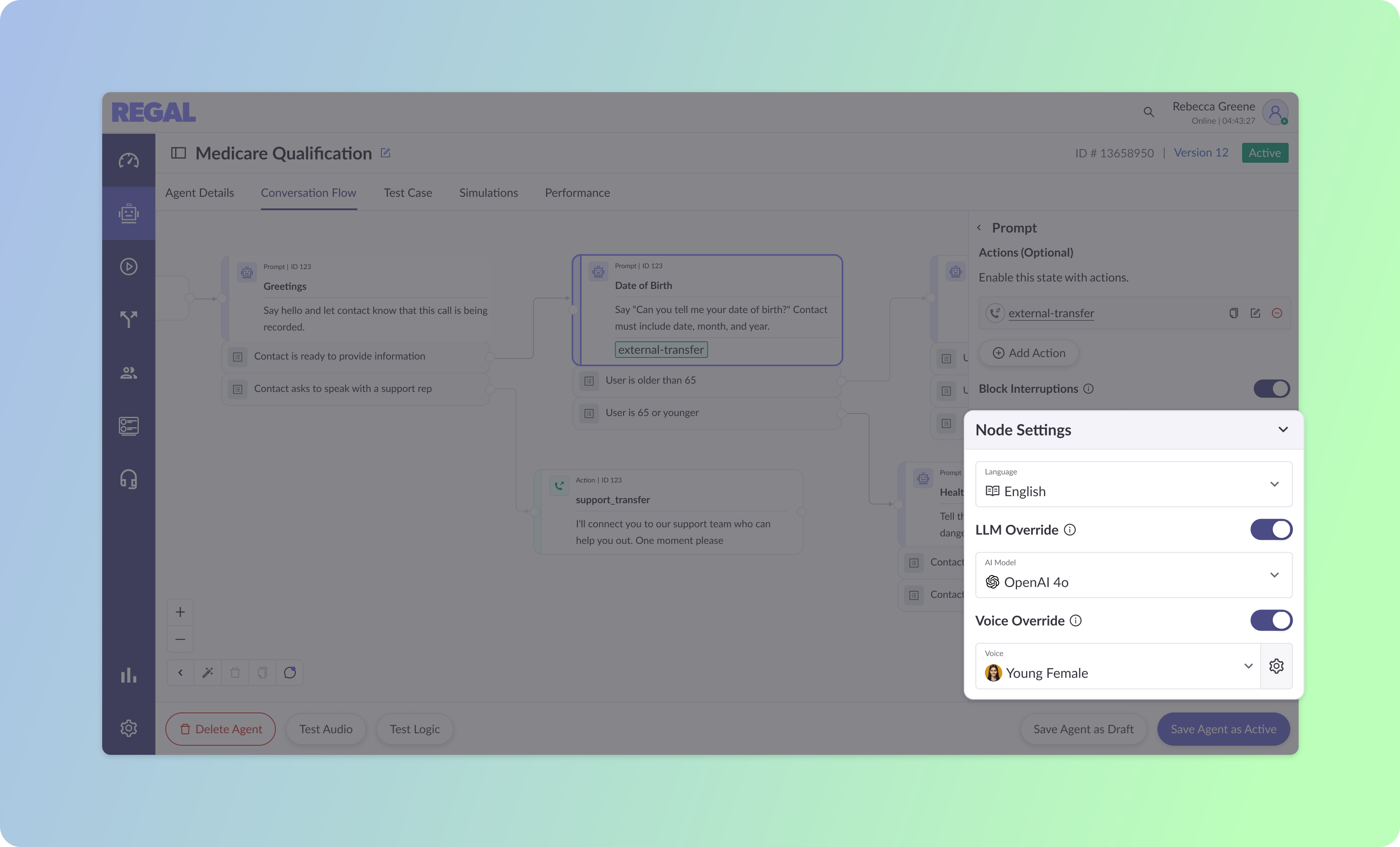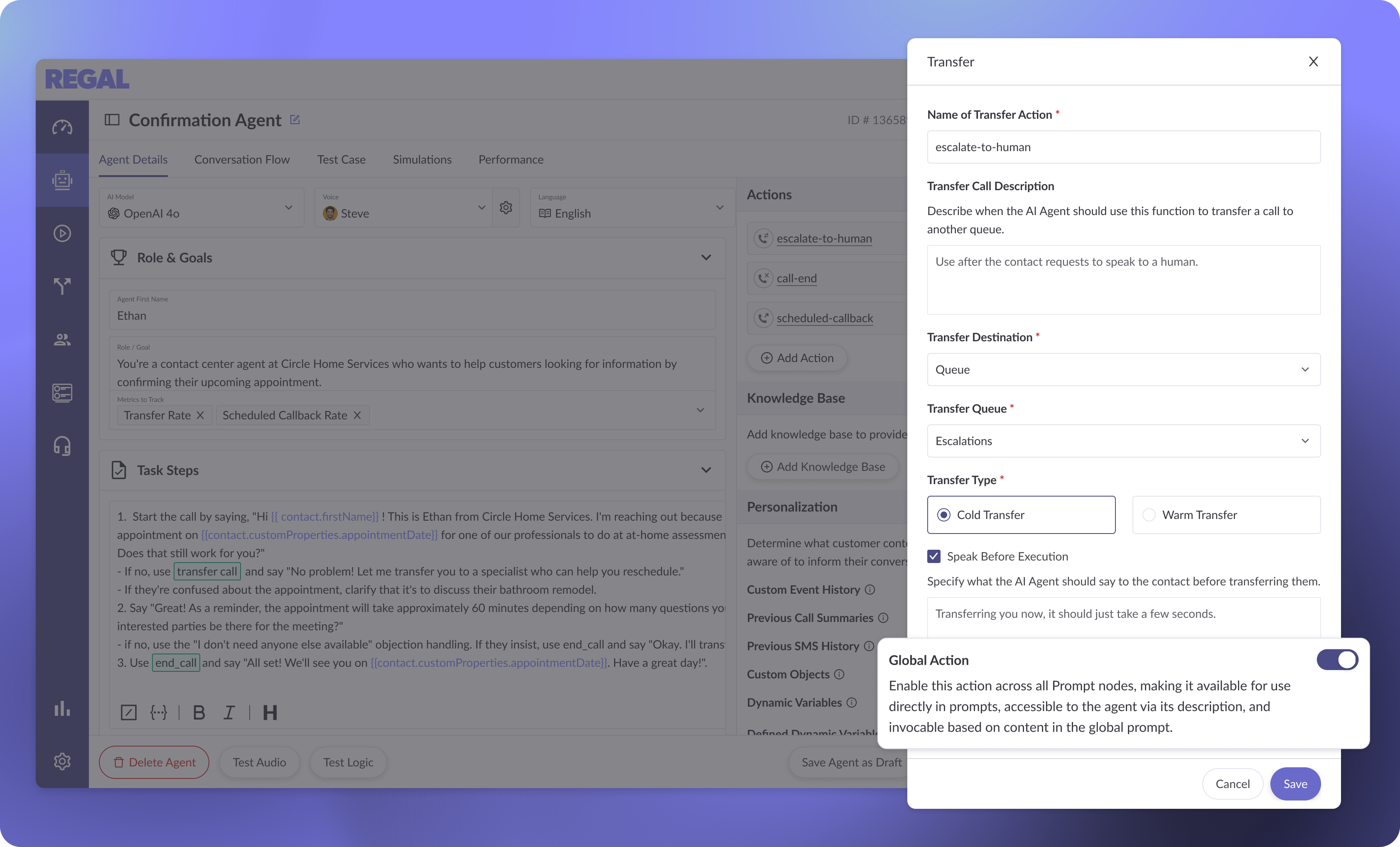 Additional LLM insights from Regal Improve help your AI agents answer more customer questions, stay in the conversation longer, and drive better outcomes from every interaction. For multi-state agent workflows, Node-Specific Settings let you fine-tune how the agent speaks and behaves at each moment in the conversation, so transitions feel fluid, not robotic. Global Actions ensure consistent logic across every interaction, without repetitive configuration.