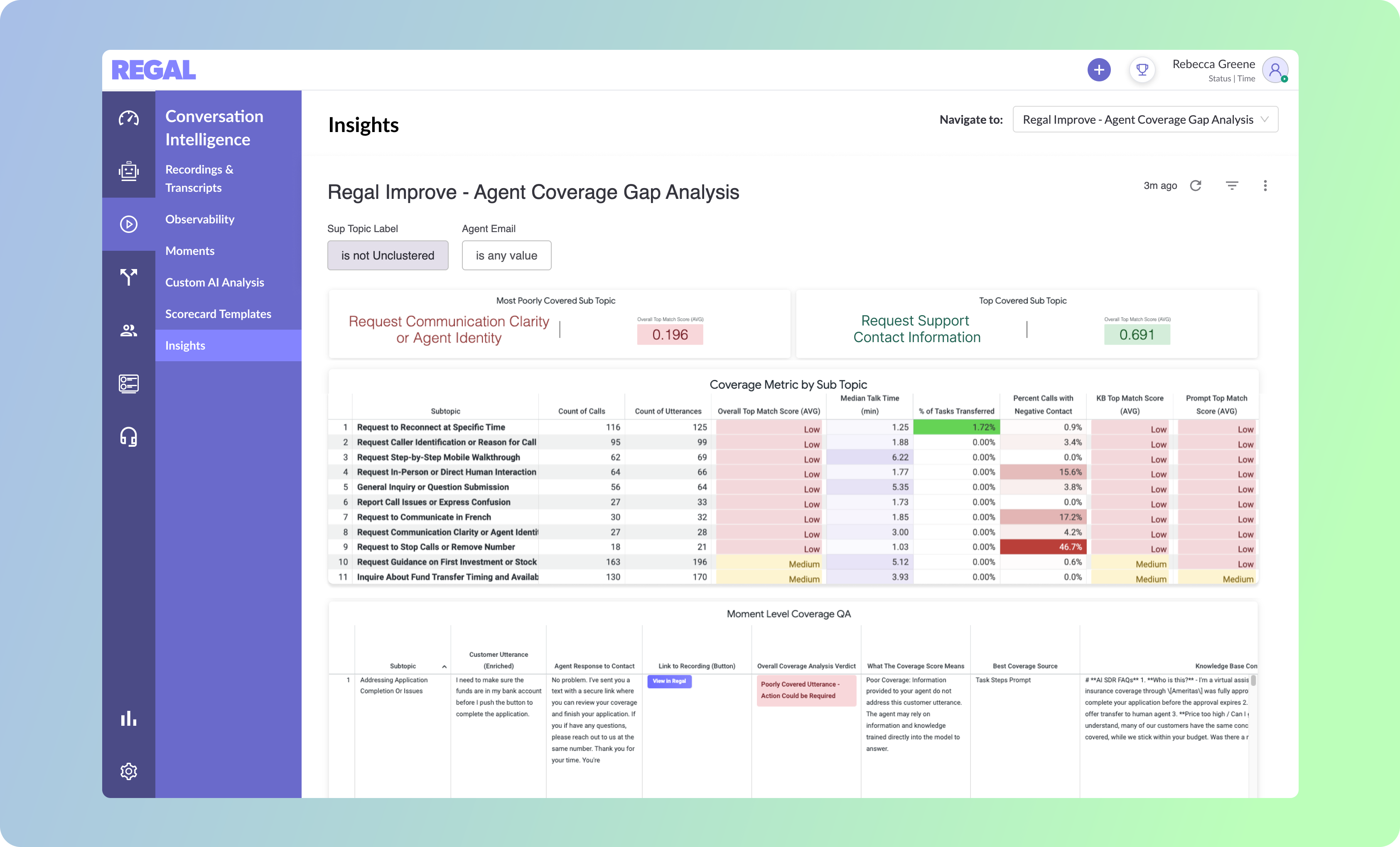 The dashboard breaks coverage into three clear layers. Knowledge Base Coverage shows how well your KB content supports a topic. Prompt Coverage reveals whether your agent prompt clearly instructs the model on how to handle that topic. The new Deep Dive view lets you review real conversations with surrounding context to see exactly how the agent responded. By pinpointing whether gaps live in your knowledge, your instructions, or real-world execution, Regal Improve helps your agents resolve more issues on the first try, reducing unnecessary transfers, improving containment, and delivering the kind of seamless experience that keeps customers coming back.