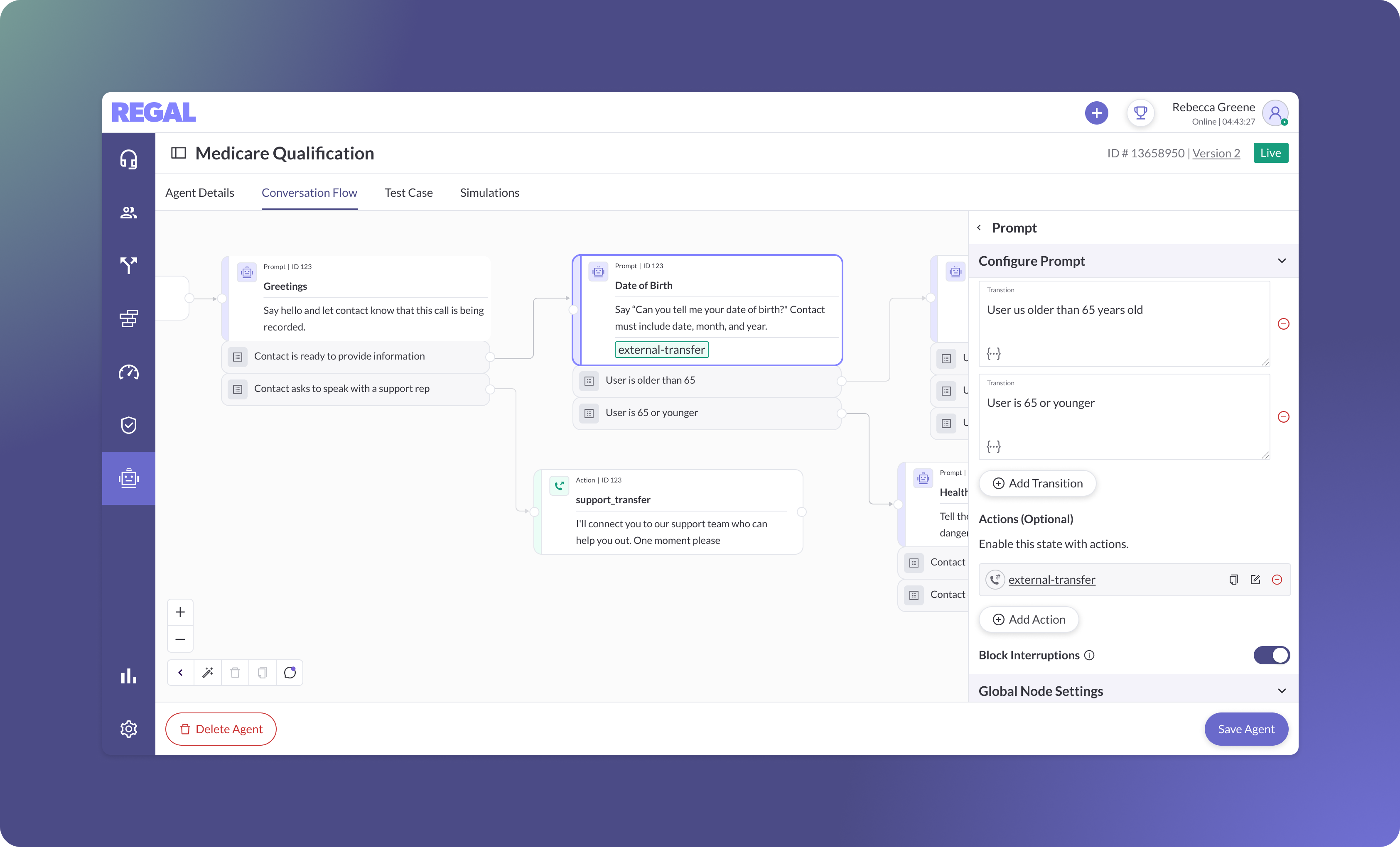In transfer-heavy outbound campaigns, qualifying a lead is only half the job. If an AI agent with unlimited capacity is handling the qualification, the real bottleneck appears when the licensed or expert human agent receiving the transfer is unavailable. That downstream variability can disrupt the flow of otherwise successful calls, and pacing dials solely on the AI agent’s capacity can quickly overwhelm the transfer team, leading to long wait times, abandoned handoffs, and lost conversion opportunities. With Transfer-Aware Dialing, Regal dynamically adjusts your outbound dialing pace based on both target and transfer queue capacity, allowing you to maintain throughput without overwhelming downstream teams.