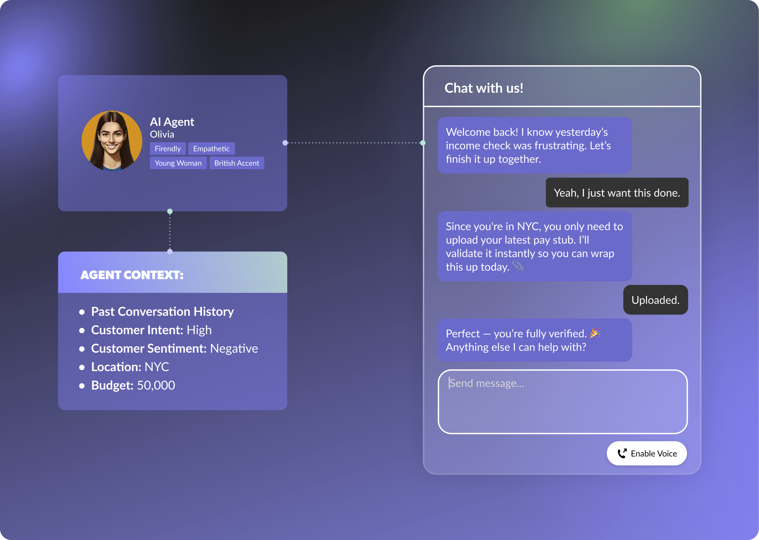 For known contacts, the agent can be even more personalized. A new customer going through onboarding asks how to set up direct deposit. The agent walks them through it, then checks their account profile and notices their balance qualifies for a high-yield savings account that would earn them an extra $200 per year. One quick suggestion, and an onboarding question becomes an expansion opportunity.