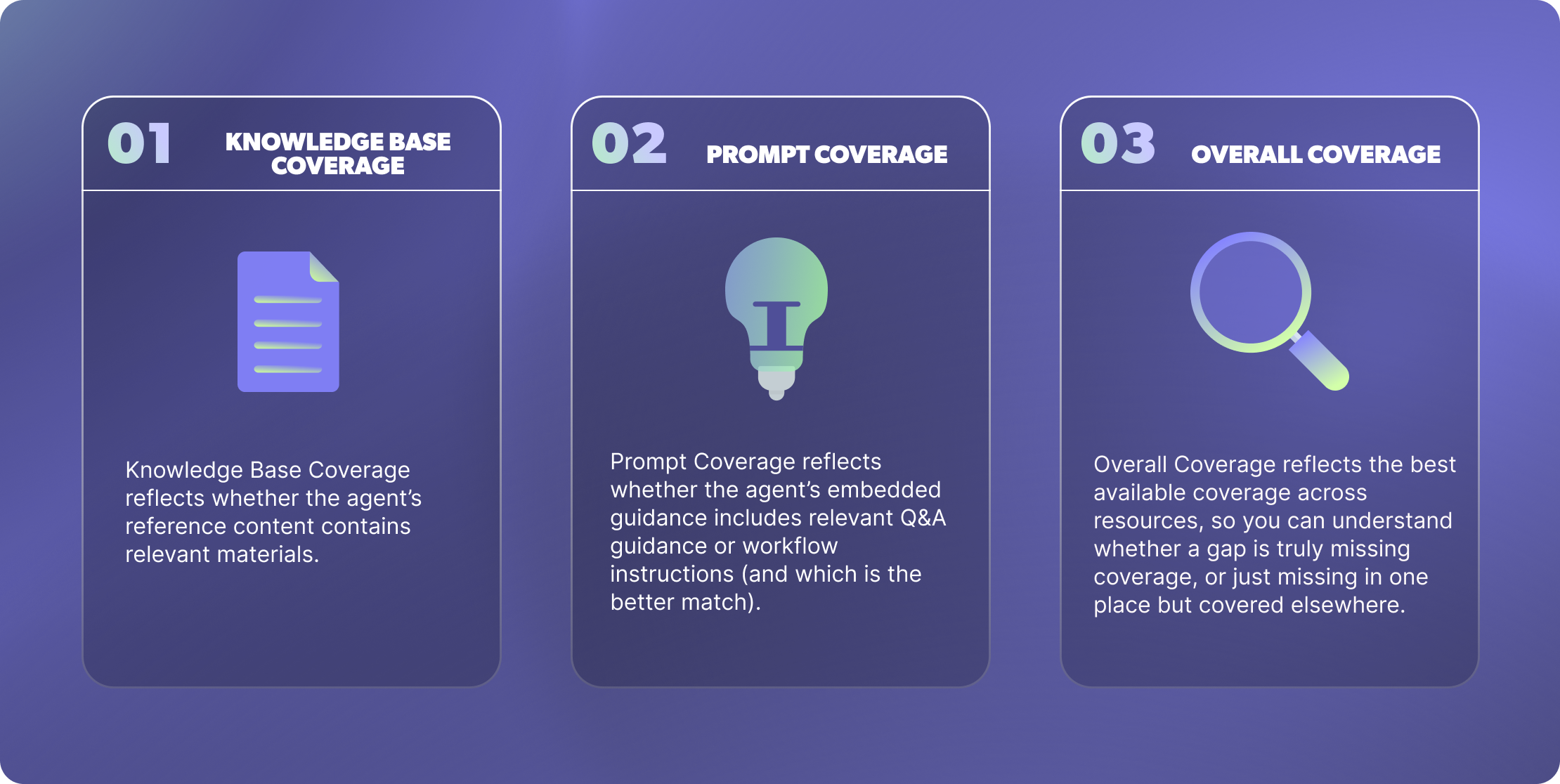 Coverage refers to whether the agent has relevant knowledge and guidance to handle real customer requests. This includes knowledge base content, prompt-based Q&A guidance, and workflow instructions. Simply uploading documents is not enough. Coverage depends on how well those resources match real customer language. If alignment is weak, the agent may still underperform even with strong documentation.