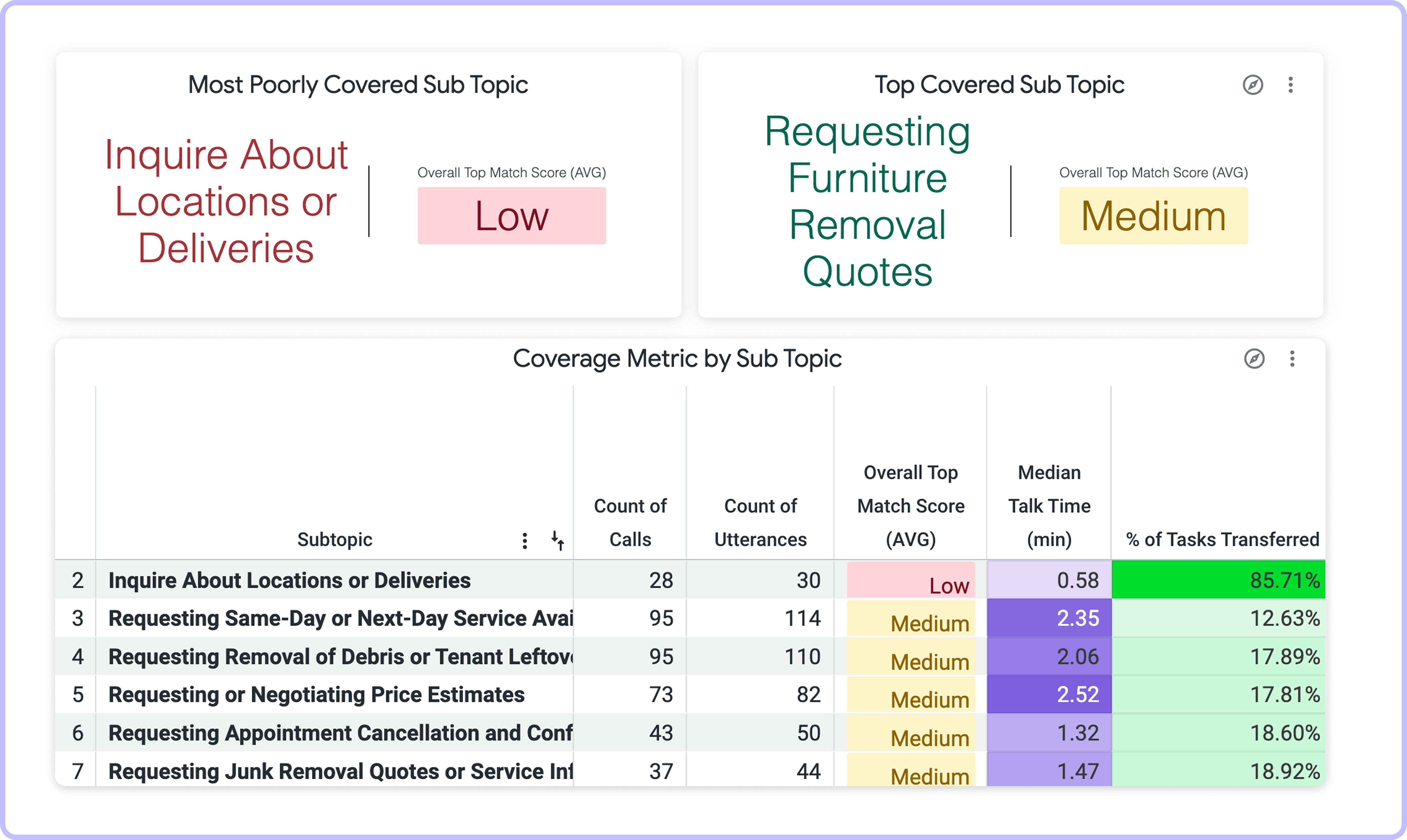 The answer to our core question must capture alignment: how well real customer language matches the knowledge and guidance available to the agent, then pairs that coverage signal with operational outcomes like talk time, transfer rate, and sentiment so teams can prioritize what actually matters.