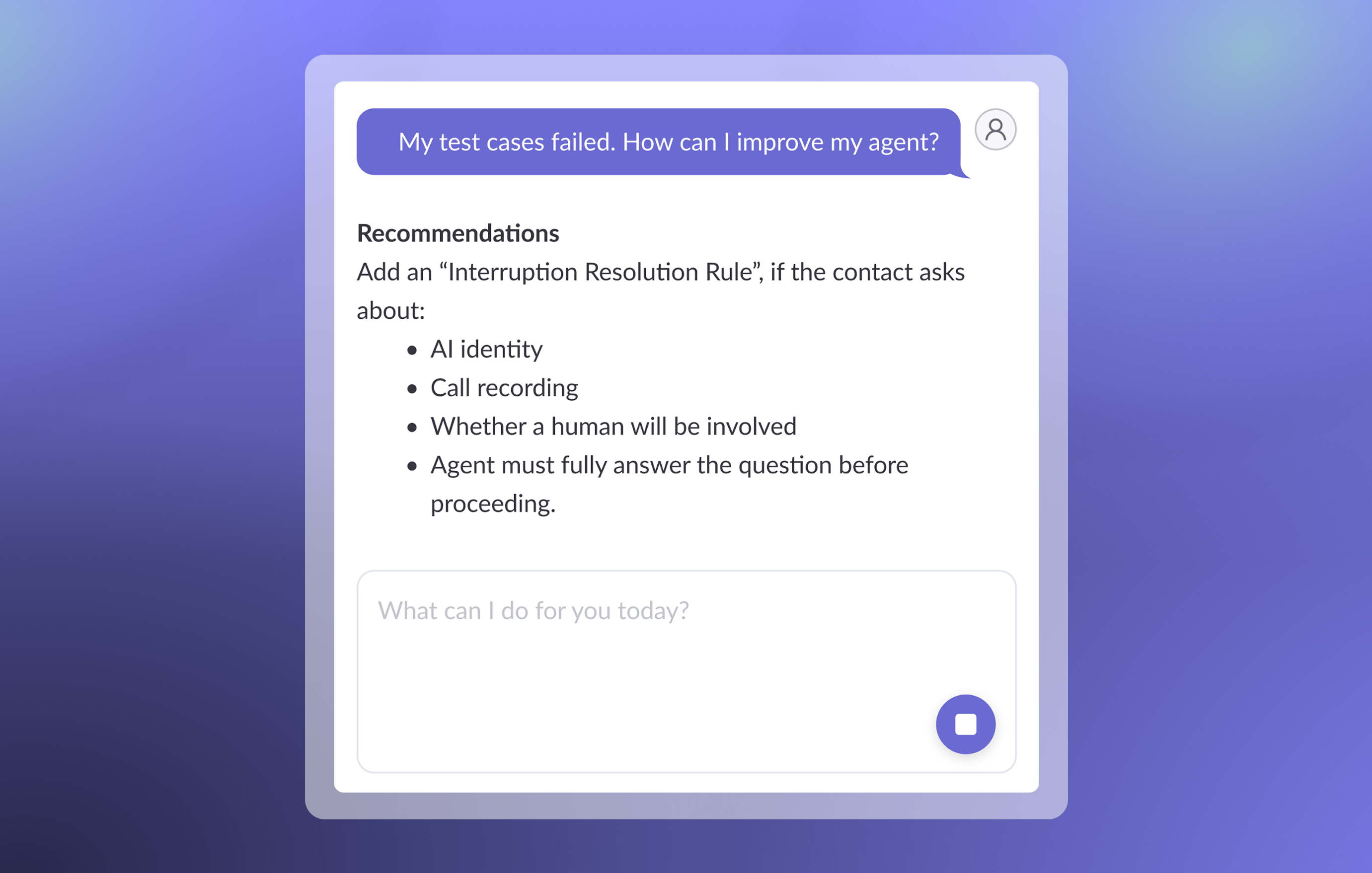 Before launch, Copilot stress-tests your agent with an auto-generated test suite to maximize logic, guardrail, and knowledge retrieval coverage, then surfaces gaps that could affect performance. This means you can identify and fix issues in a controlled environment rather than discovering them through real customer interactions.